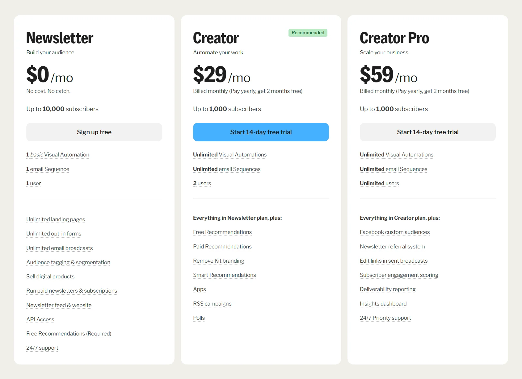 | $29/miesiąc | Wszystkie funkcje planu Newsletter, plus: nieograniczone automatyzacje, sekwencje e-mailowe, 2 użytkowników, aplikacje, kampanie RSS, ankiety, usuwanie brandingu Kit, i więcej. | |