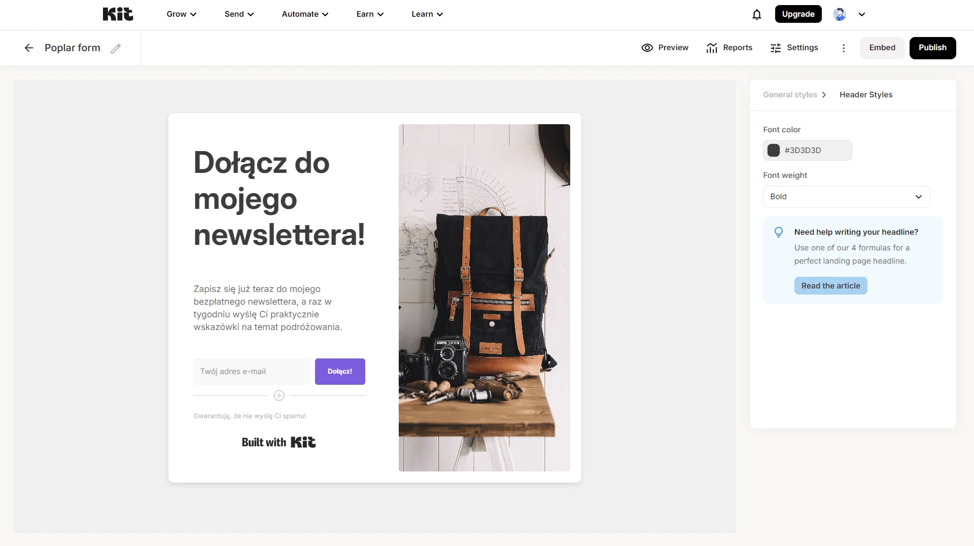 Platforma od Kit pozwala też na tworzenie formularzy zapisu do newslettera, takie jak formularze osadzone, pop-upy czy slide-iny, które można umieścić na swojej stronie internetowej.