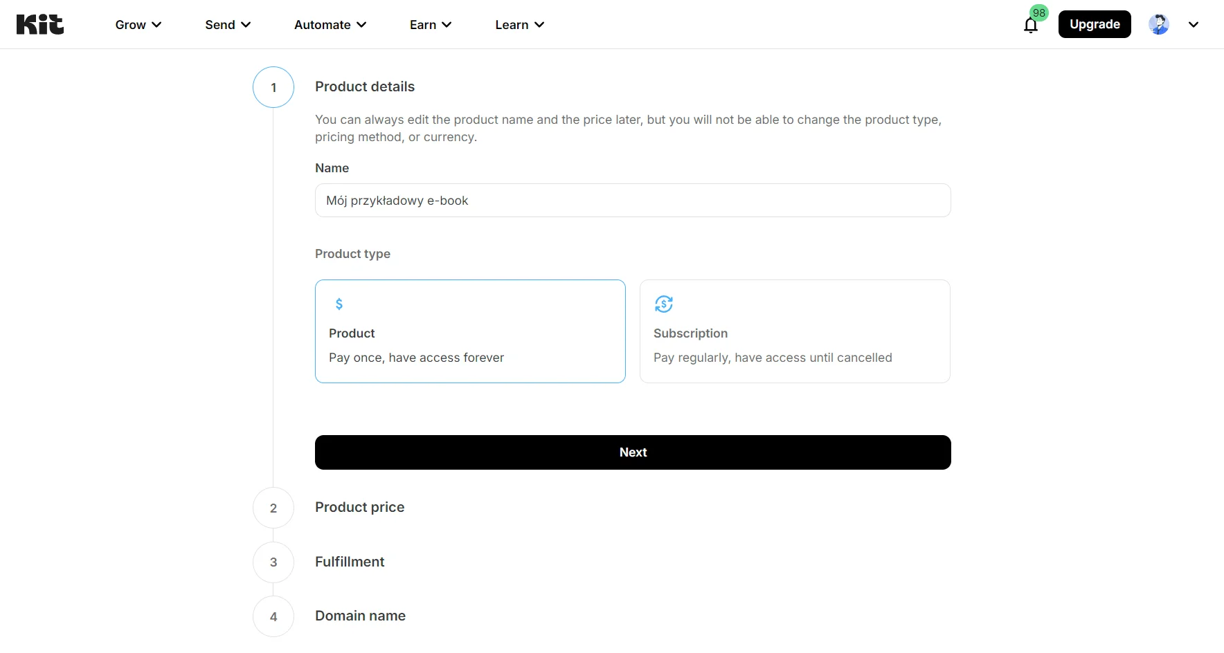 Funkcja sprzedaży produktów cyfrowych w Kit jest bardzo łatwa w obsłudze – dodawanie produktów to kwestia kilku kliknięć. Należy jednak pamiętać, że po rozpoczęciu sprzedaży będzie pobierana prowizja w wysokości 3,5% + 30 centów od każdej transakcji.