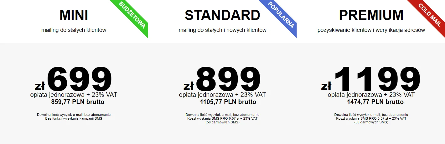 | Mini | 699zł | Do 5 PC, grupy po 25 000 e-maili, bez SMS, AI do treści, brak linku rezygnacji, whitelabel, antyspam, Mail-Tester. |