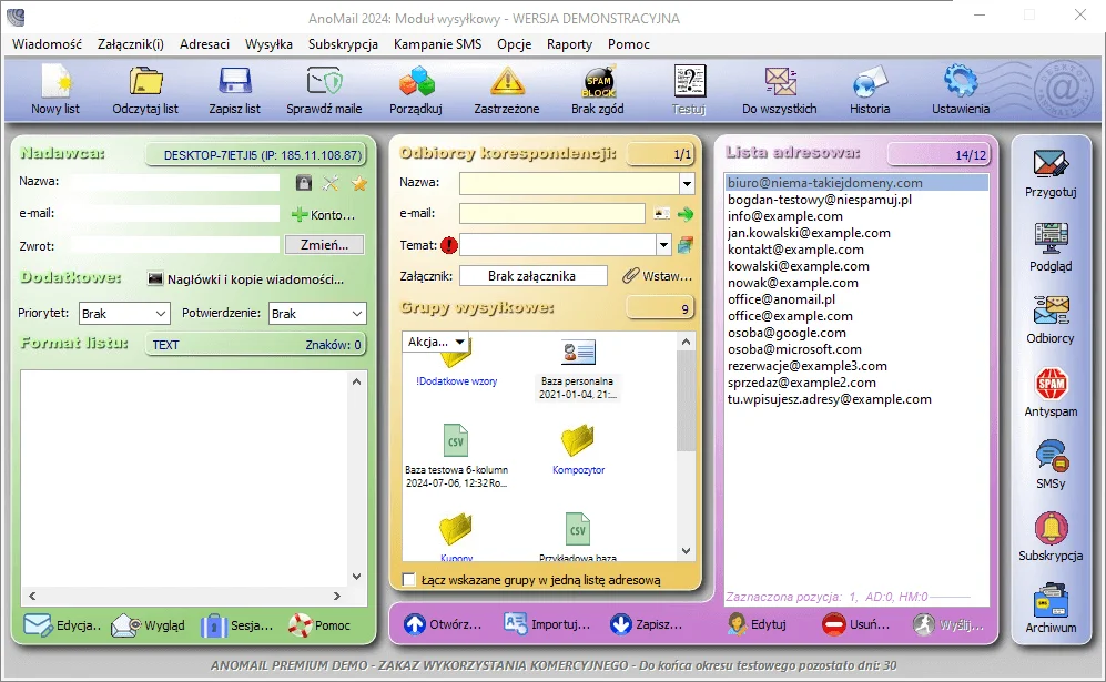 Na plus też raporty zwrotek (bounces) – AnoMail potrafi rozpoznać, do kogo mail nie dotarł i z jakiego powodu: nieistniejące konto, zapchana skrzynka czy blokada antyspamowa. Program automatycznie sugeruje usunięcie takich adresów z bazy, co ułatwia utrzymanie jej w dobrej kondycji.