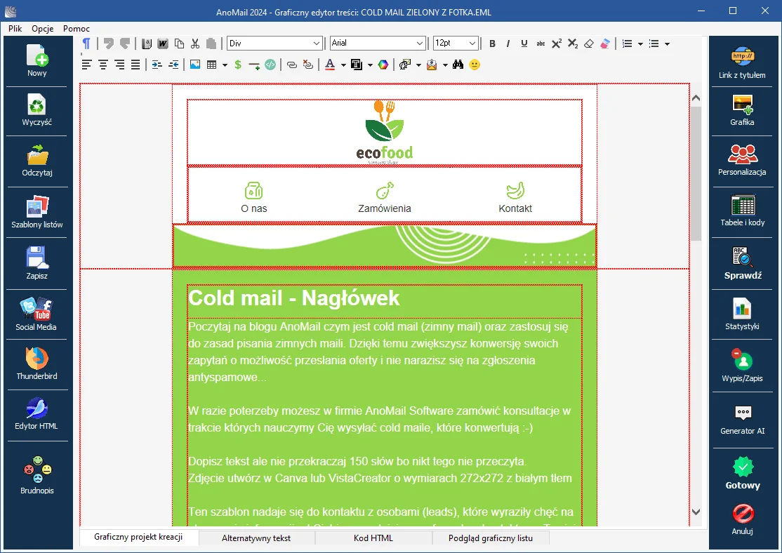 Niestety – proces tworzenia newsletterów w AnoMail jest bardzo skomplikowany. Wbudowany edytor wiadomości e-mail jest trudny do opanowania, zwłaszcza dla początkujących. Zajmuję się e-mail marketingiem od kilku lat, a mimo to sam miałem spore problemy z projektowaniem wiadomości w programie AnoMail.