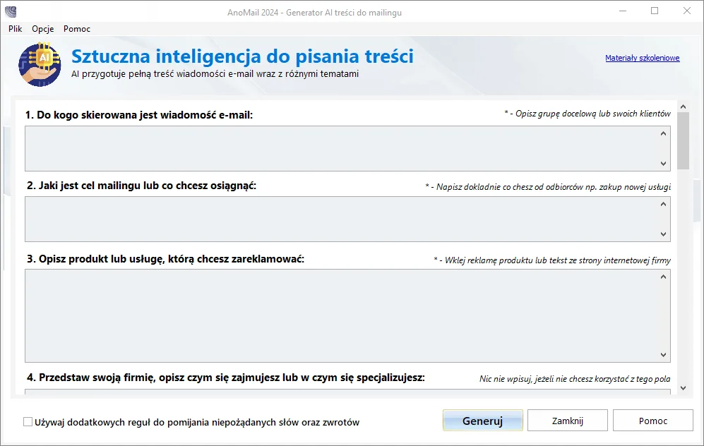 Tak, AnoMail to polski program do mailingu, który działa w całości po polsku. Cały interfejs, dokumentacja i pomoc techniczna są dostępne w języku polskim.