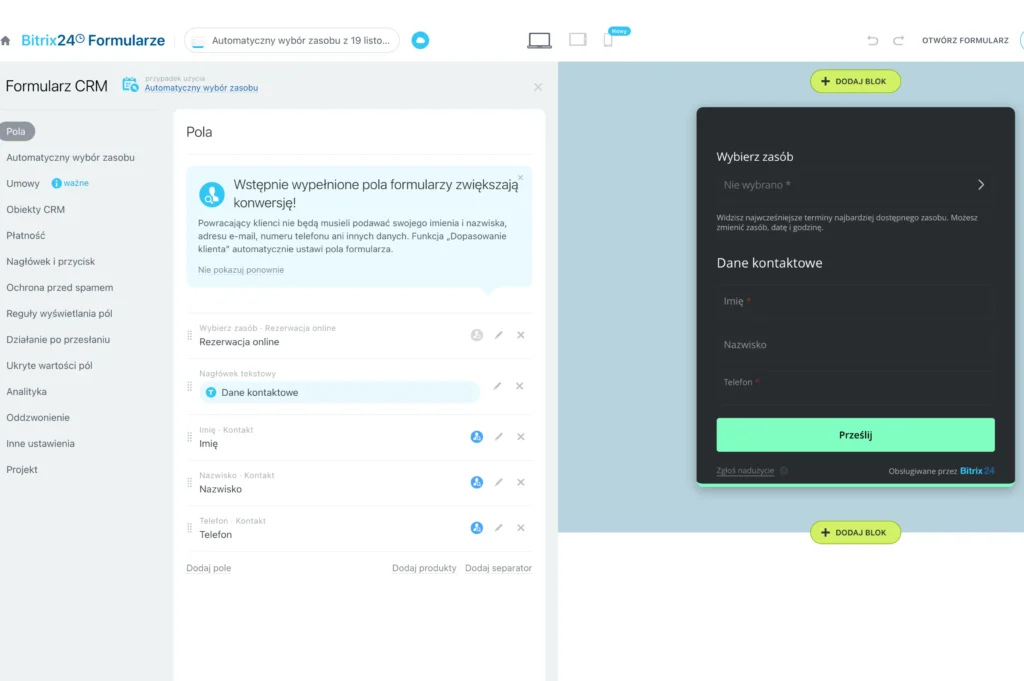 Każdy formularz możesz dostosować do własnych potrzeb – określić pola do wypełnienia, takie jak imię, telefon czy temat konsultacji, a także wybrać zasoby dostępne do rezerwacji. To sprawia, że cały proces rezerwacji jest prosty, a jednocześnie pozwala zebrać komplet informacji potrzebnych do obsługi klienta.
